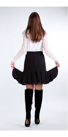 Юбка – 12 клиньев годе, заужена ниже линии бедра, каждый клин имеет «резкое» расклешение, что создает шикарный объем по низу юбки. Низ юбки декорирован атласным кантом.