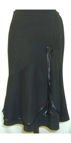 Отделка: на переднем полотнище юбки ассиметричная кокетка, нижний волан из основной ткани, верхний волан из шифона. Край волана обработан атласным кантом. Украшение - брошь из черного бисера, 5-ть атласных ленточек. Сзади четыре клина годе.