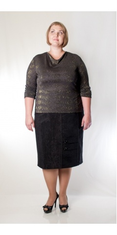Отделка: на переднем полотнище юбки вставка из основной ткани с поперечными полосками и 2-е паты с пуговицами. Вставка выделена атласным кантом.