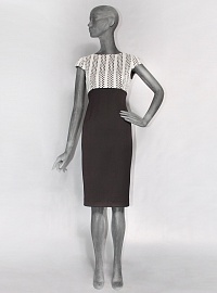 Платье выполнено из плотной костюмной стрейч ткани диагоналевого переплетения. Верх платья дополнен вторым слоем из кружевного полотна.