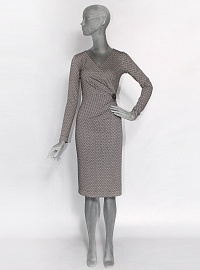 Платье выполнено из мягкого трикотажного полотна жаккардового переплетения. Ассиметричный крой акцентирован съёмным украшением.